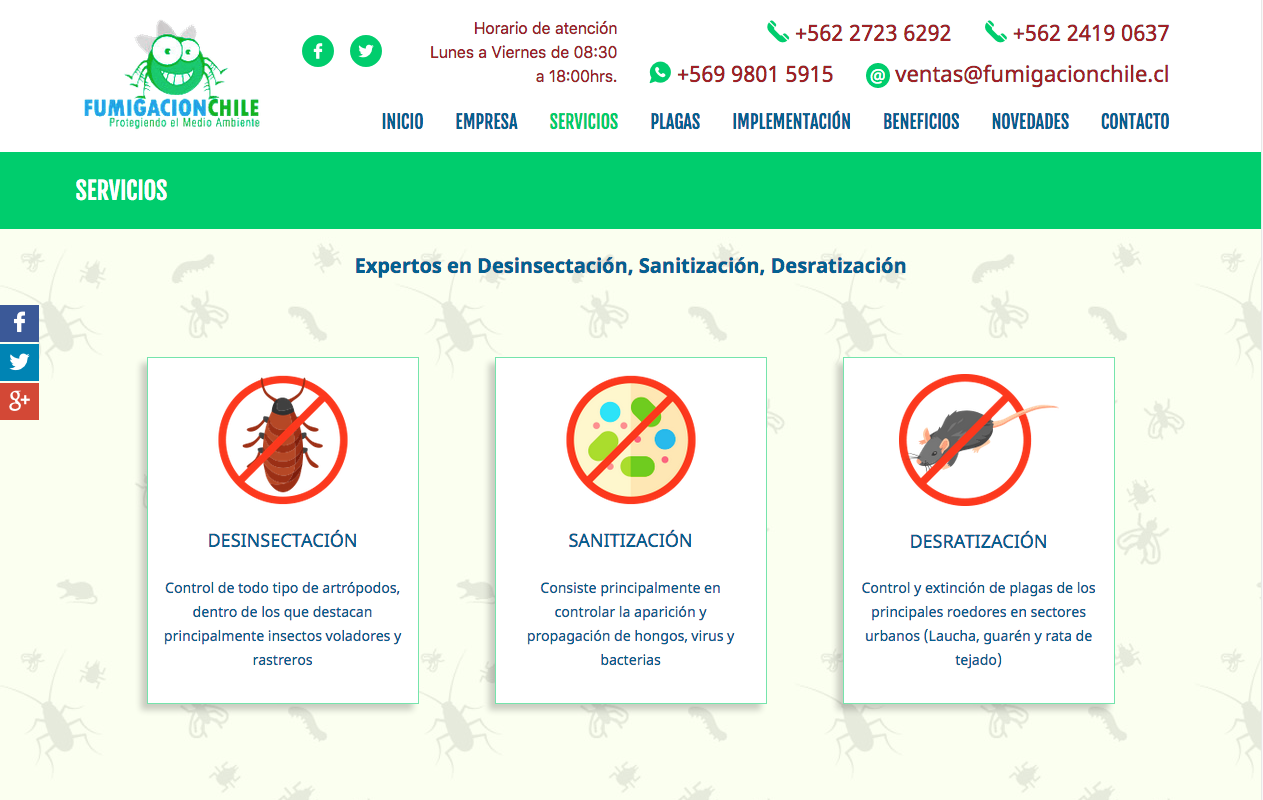 Somos una empresa con mas de 3 años de experiencia en la fumigación y los servicios de control de plagas en la Región Metropolitana de Santiago de Chile. Entregando resultados eficientes y duraderos los cuales nos han llevado a estar en el top 10 de empresas que realizan esta labor en el país con el valor agregado de conservar el medio ambiente. Continua leyendo “Fumigación Chile, fumigación de murciélagos, arañas, palomas en Santiago”